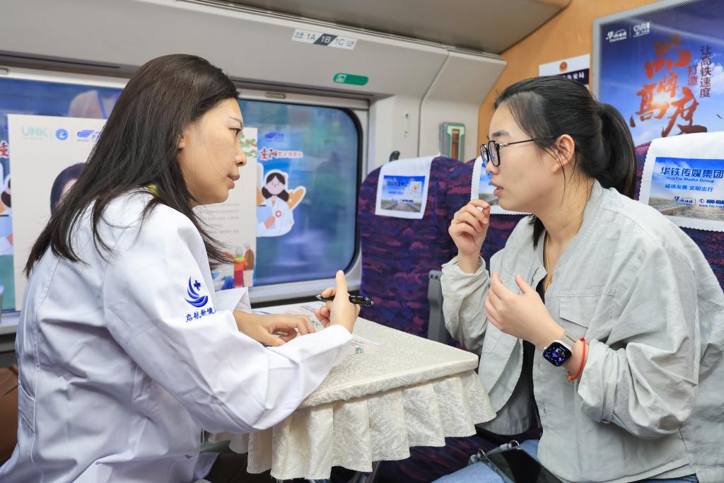 10月19日,在G8388次列车上,医生为旅客提供健康咨询。