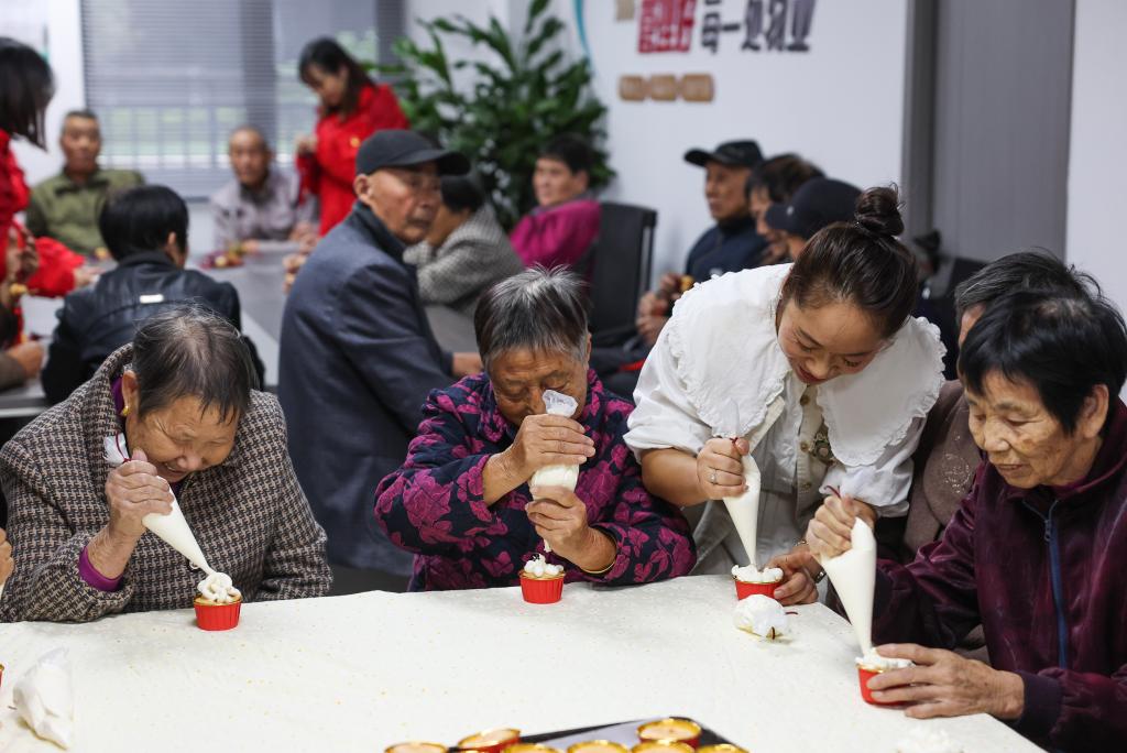 10月21日,志愿者在教老人制作纸杯蛋糕。
