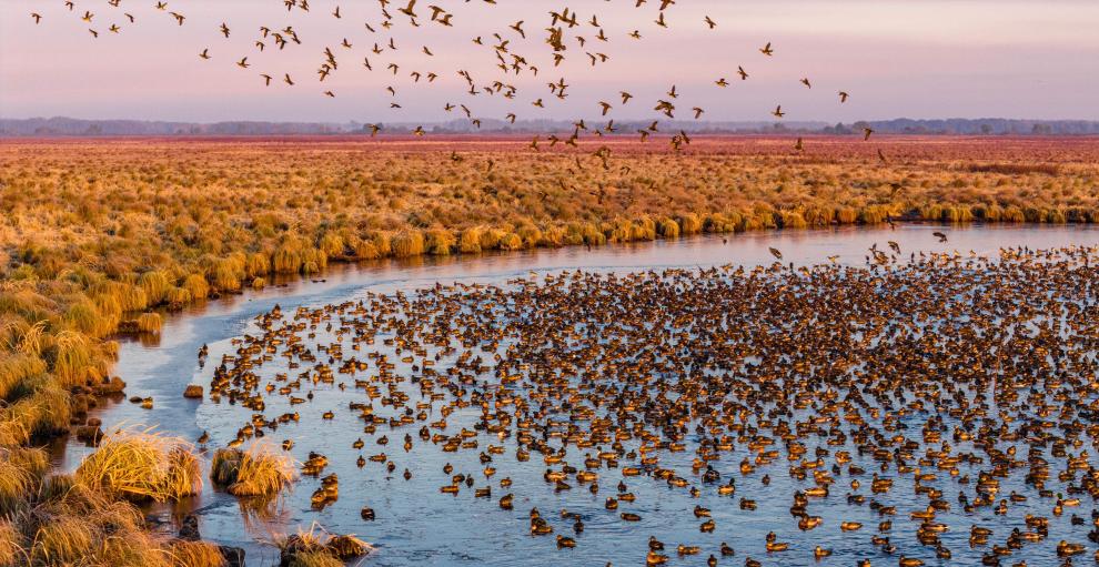 10月22日,在黑龙江挠力河国家级自然保护区,候鸟在晨光中翔集(无人机照片)。