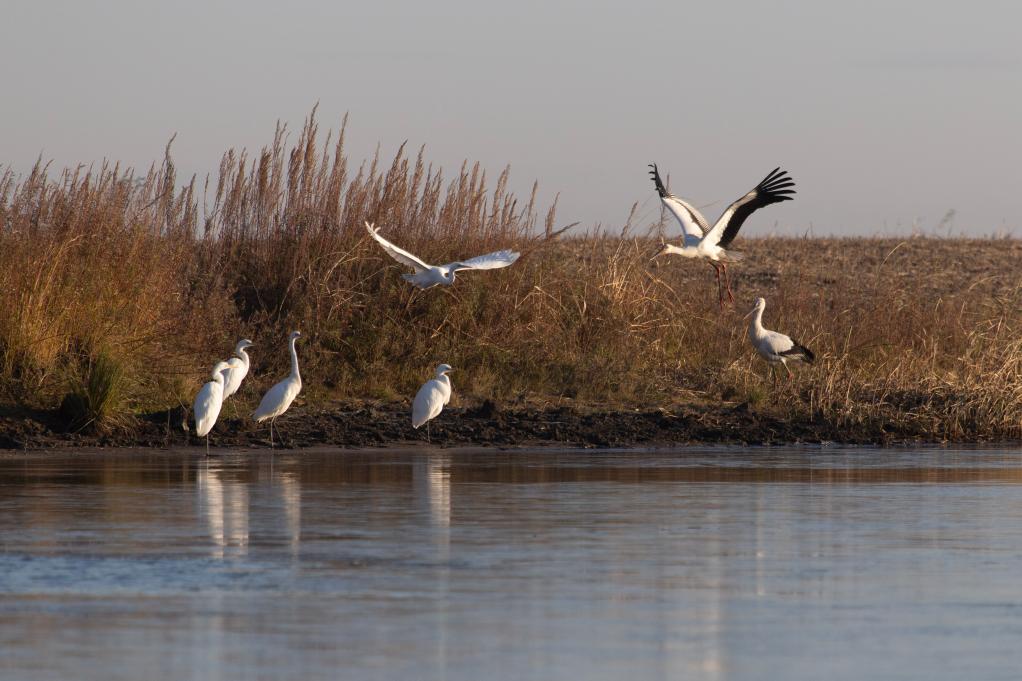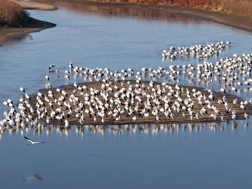10月22日,东方白鹳在松花江富锦段沿江湿地集结(无人机照片)。