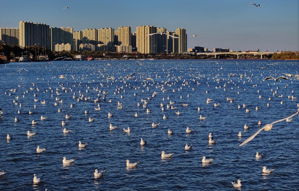 10月21日,候鸟在松花江哈尔滨段上空飞翔。