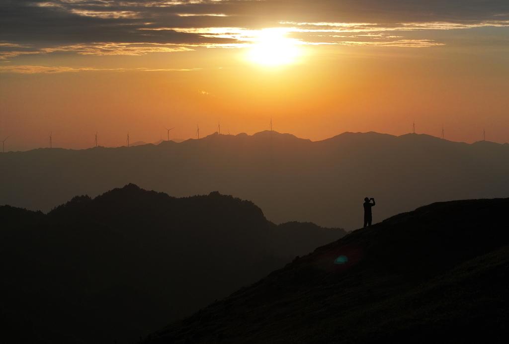 在广西融水苗族自治县杆洞乡尧告村高山牧场,游客在欣赏日落景色(2024年8月15日摄)。