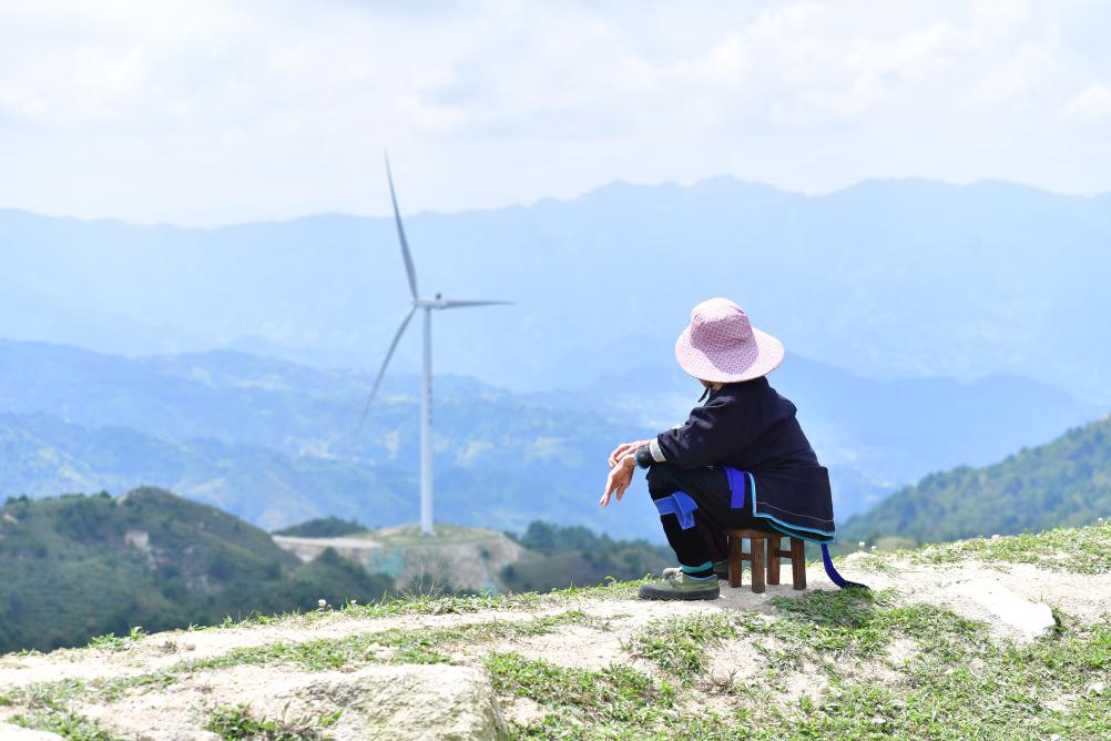 在广西融水苗族自治县杆洞乡尧告村高山牧场,老人在山顶眺望远山(2021年8月22日摄)。