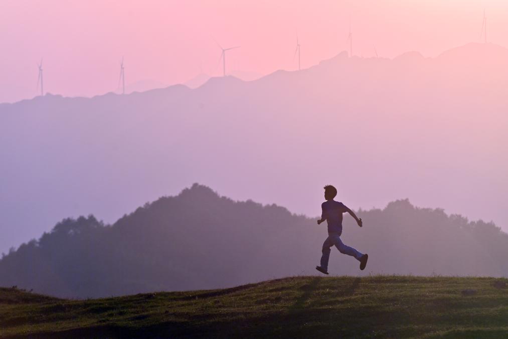 在广西融水苗族自治县杆洞乡尧告村高山牧场,一名少年在夕阳下奔跑(2024年8月14日摄)。