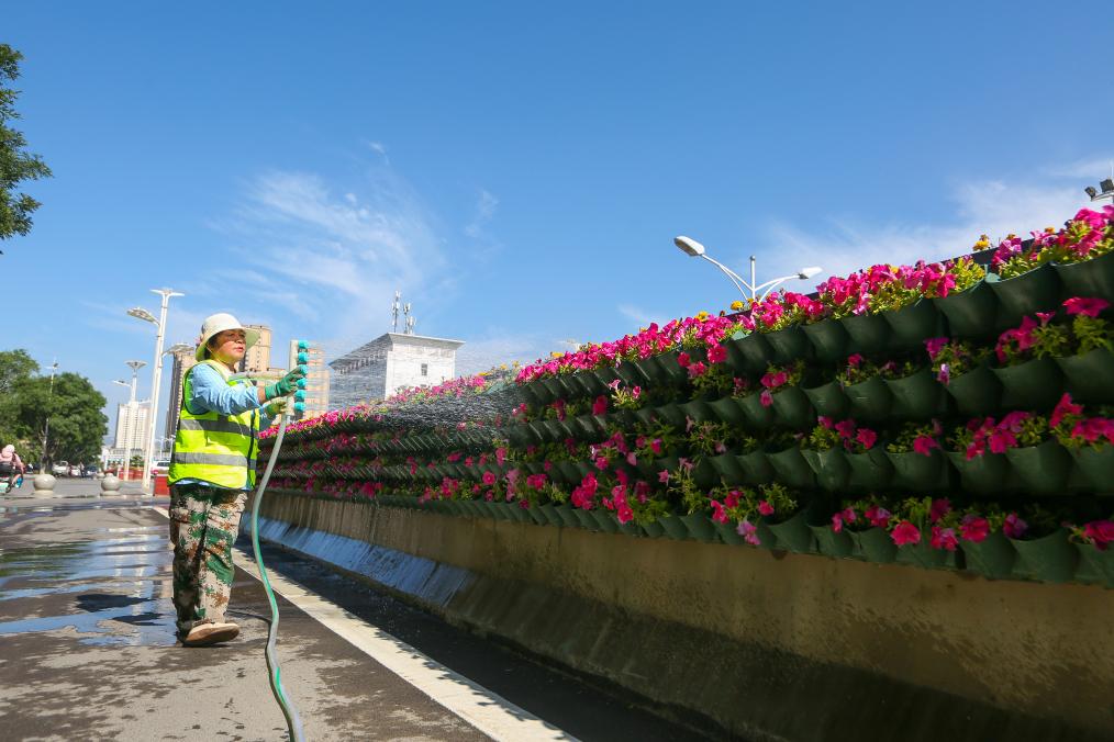 2025年6月5日,工作人员在平凉市一街道路边养护花卉苗木。