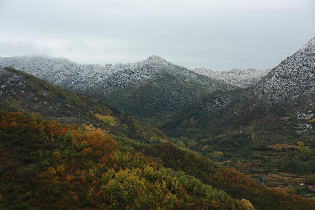 这是2025年10月17日在平凉市崆峒区拍摄的太统崆峒山国家级自然保护区深秋初雪景色。