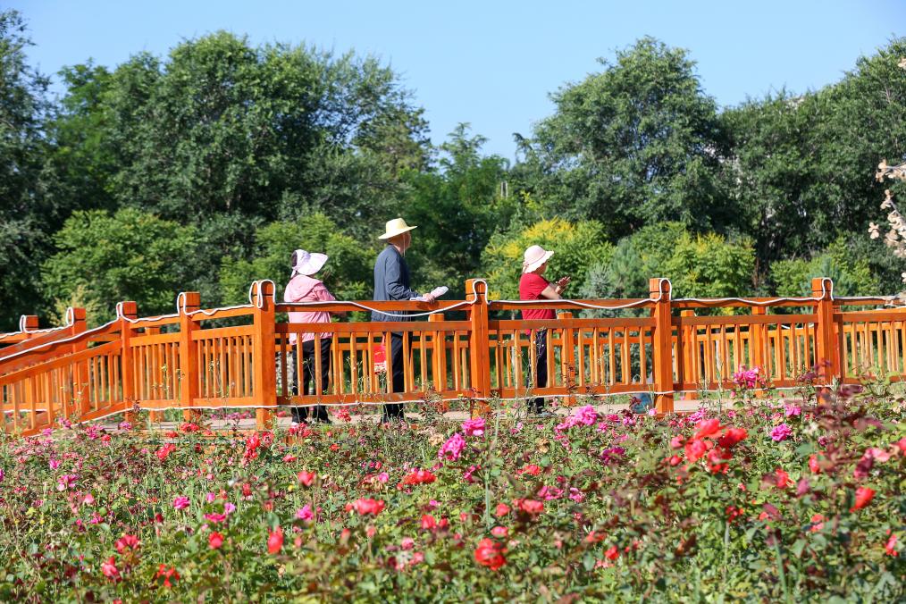 2025年7月7日,市民在平凉市崆峒区中心城区的平凉城市活力公园赏花、锻炼。