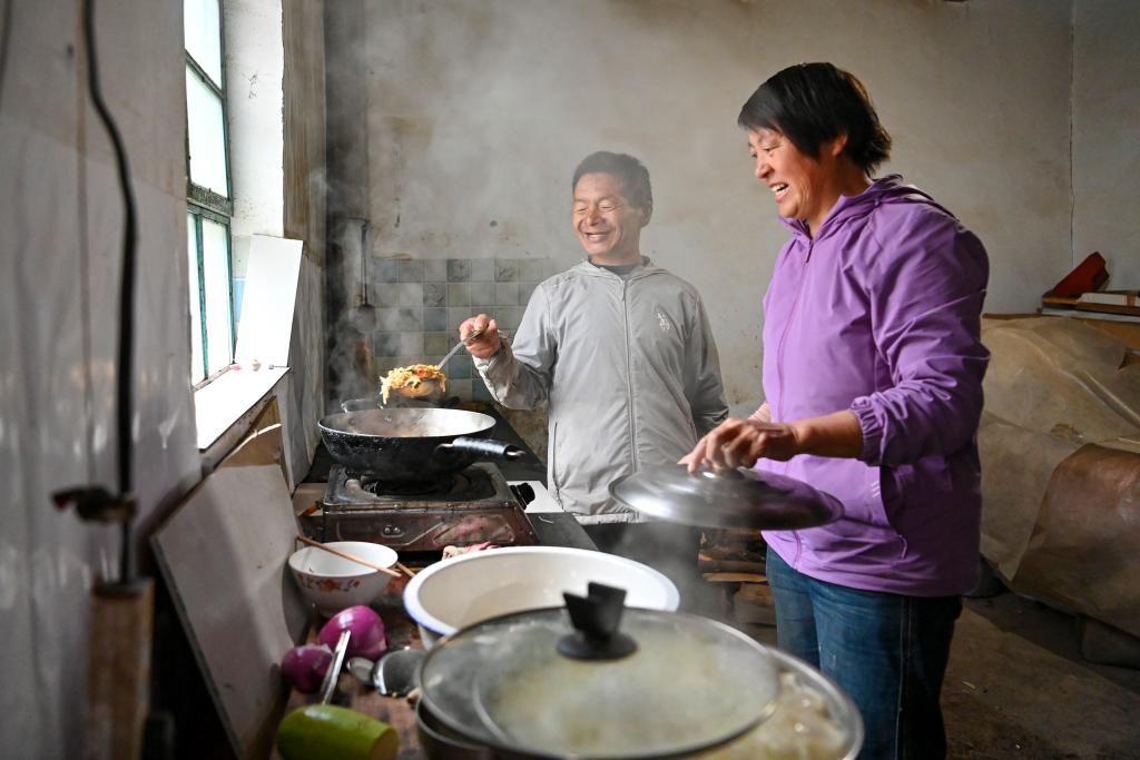在山西省平顺县东寺头乡黄崖沟自然村,村民程娇梅(右)为秦海松准备午饭(10月11日摄)。