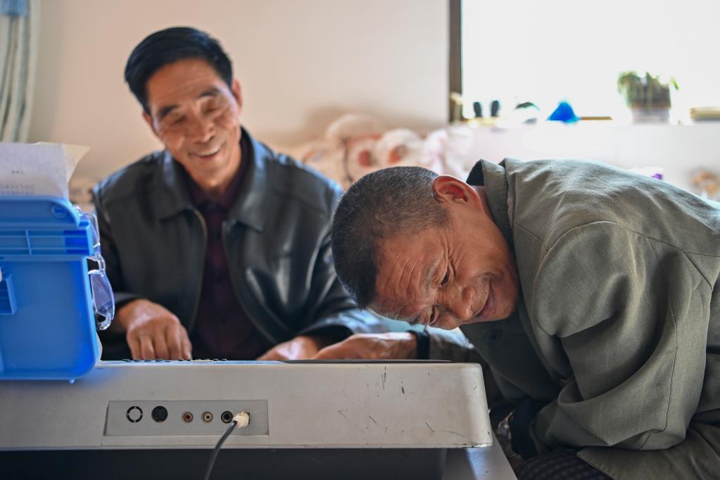 在山西省平顺县东寺头乡黄崖沟自然村,秦海松(右)尝试倾听电子琴发出的声音(10月14日摄)。