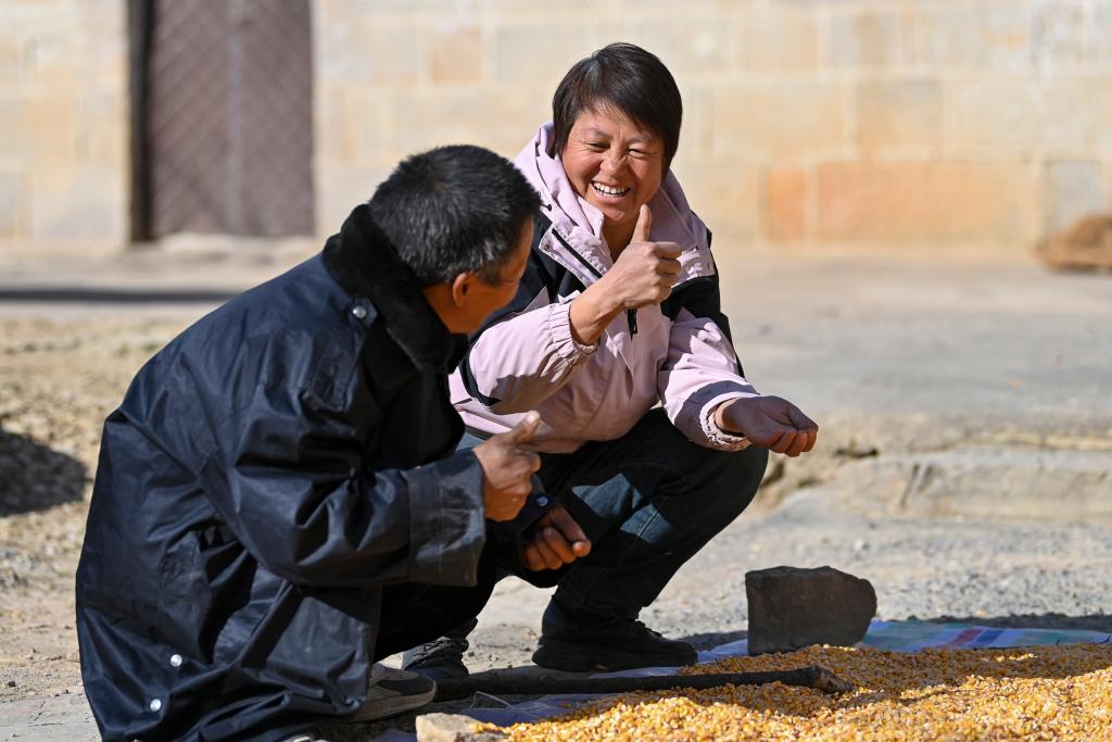 在山西省平顺县东寺头乡黄崖沟自然村,村民程娇梅(右)向帮忙捡玉米的秦海松表达感谢(12月1日摄)。