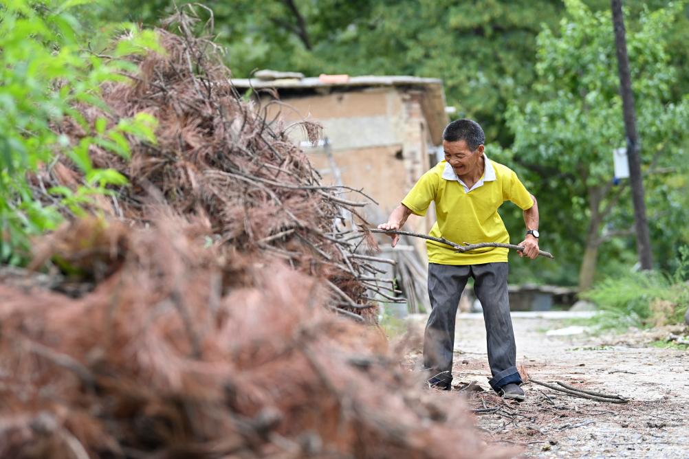 在山西省平顺县东寺头乡小南铺自然村,秦海松为村民元有才准备柴火(8月6日摄)。