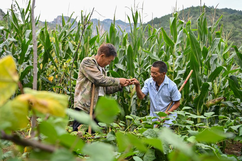 在山西省平顺县东寺头乡黄崖沟自然村,村民桑建平(左)为秦海松夹菜(8月27日摄)。