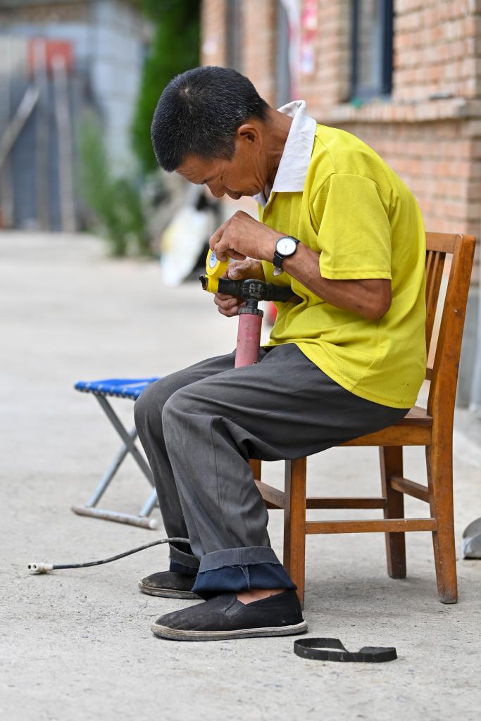 在山西省平顺县东寺头乡小南铺自然村,秦海松用胶带修补村民元有才家里的打气筒(8月6日摄)。
