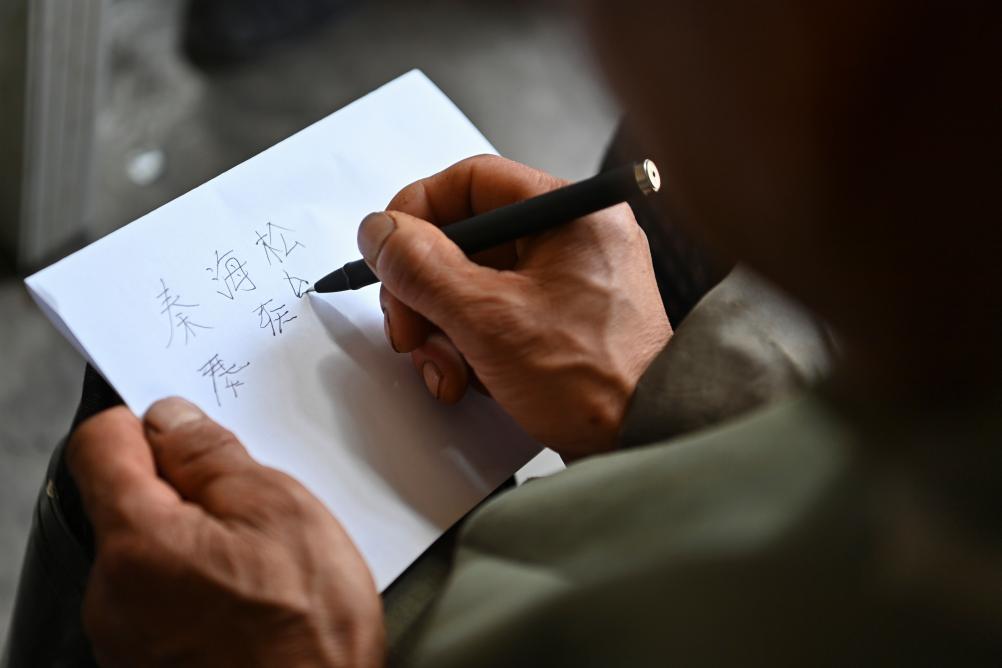 在山西省平顺县东寺头乡黄崖沟自然村,秦海松练习写自己的名字(10月14日摄)。