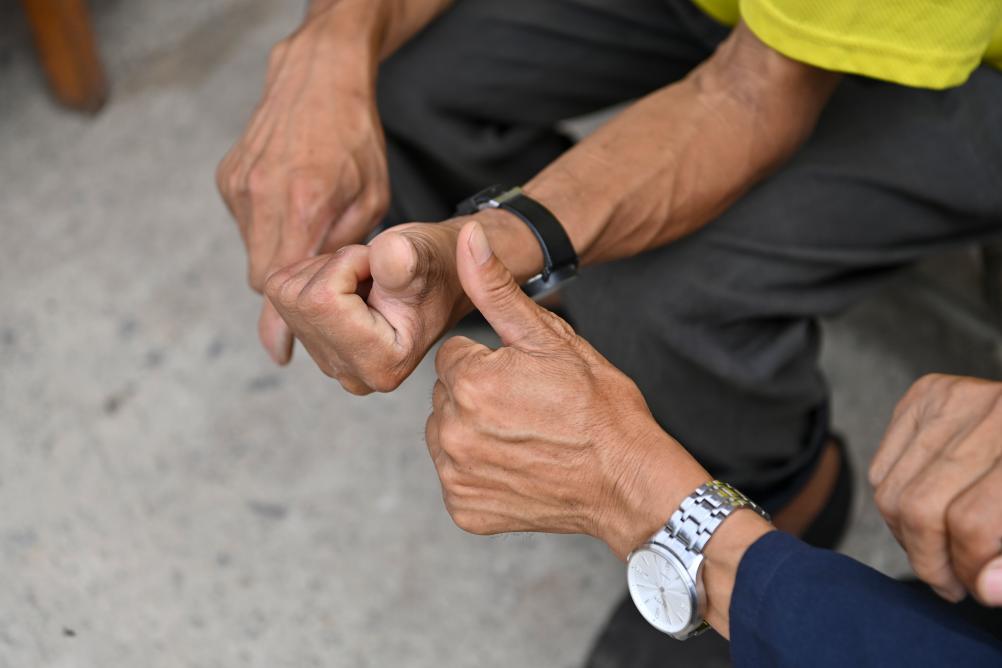在山西省平顺县东寺头乡小南铺自然村,村民和秦海松(上)通过手势交流(8月6日摄)。