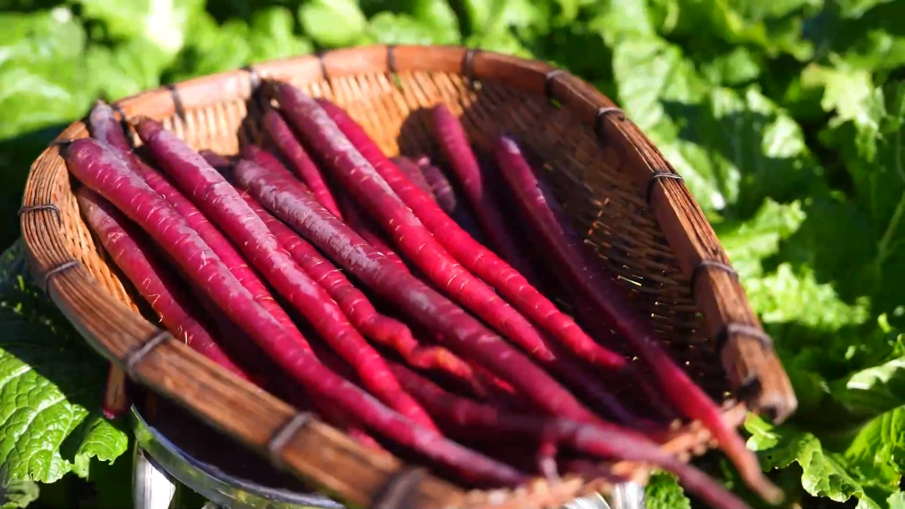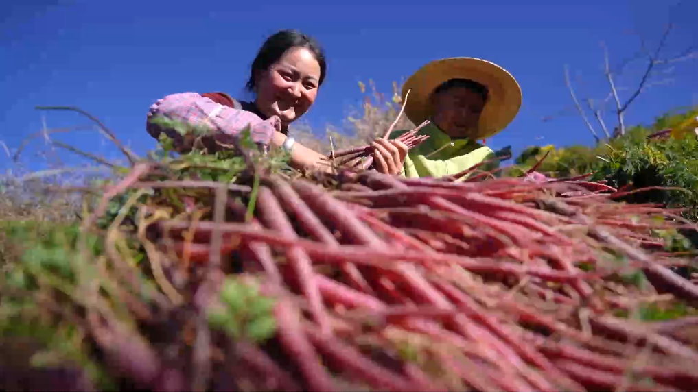 仲冬,云南省大理白族自治州洱源县千亩“紫色胡萝卜”开始采挖,当地人称为“紫玉萝”。因果质脆甜、糖度较高,通过订单农业直供大城市商超,为当地冬日经济增动力。