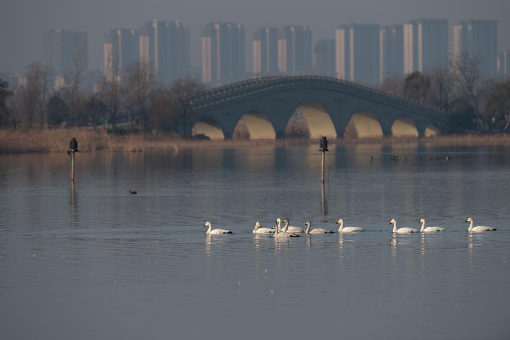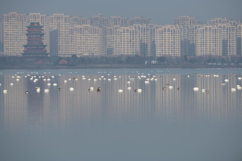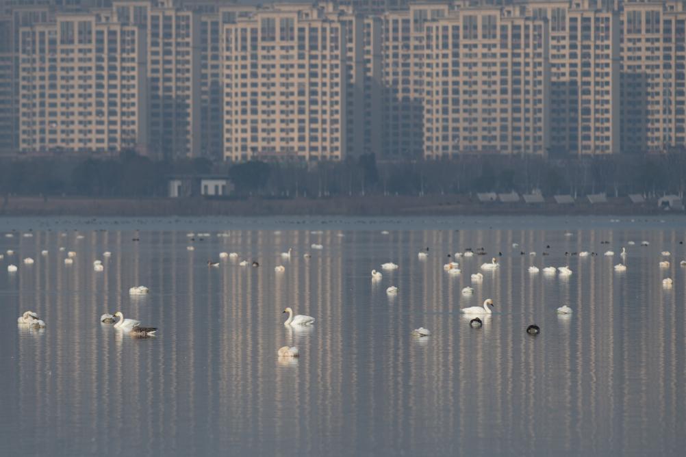 进入冬季,成群的候鸟飞抵安徽省滁州市明湖公园,在此休憩、觅食。明湖公园是一座融合自然景观与人文景观的城市公园,优良的水质、丰茂的水草和丰富的鱼虾资源,使这里逐渐成为天鹅等越冬候鸟和各种鸟类的栖息地。