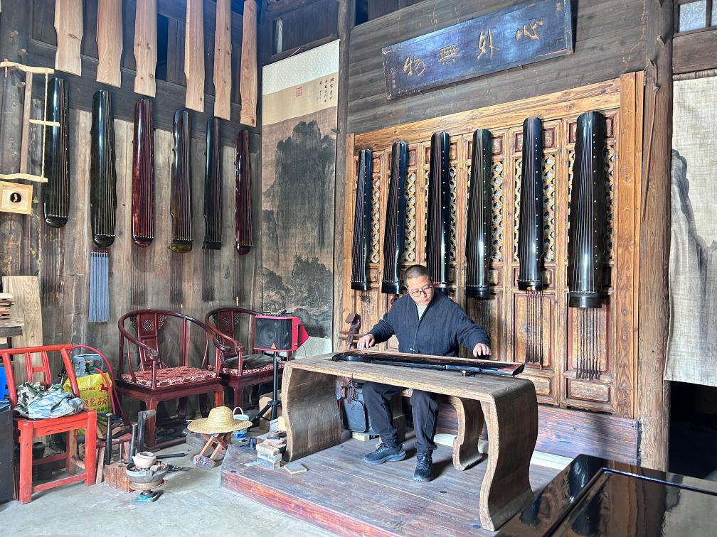 他最受欢迎的漆器作品当数古琴,尤其古琴斫制中的髹饰工序,充分体现了古代漆艺的精湛水平。许多古琴爱好者专程前来定制、修琴或学琴,也带来各自的技艺落地生根,纷纷开起小店。