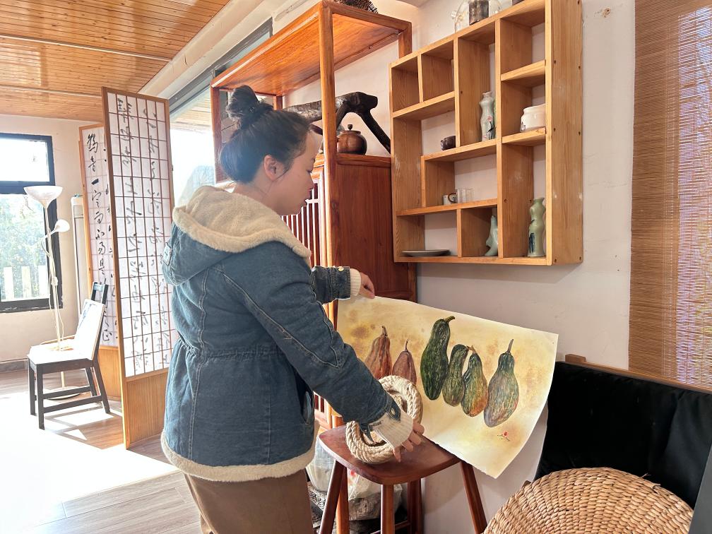“审美是可以带动的。我刚来时在院里种花,邻居大妈还不理解。后来不少人家门口都种上了花,甚至品种更丰富。到了四五月,真是满园春色。”林一蓓说。乡村野趣同样滋养着艺术灵感,南瓜、小雏菊、豆角花、黄柿子,都是她笔下的主角。