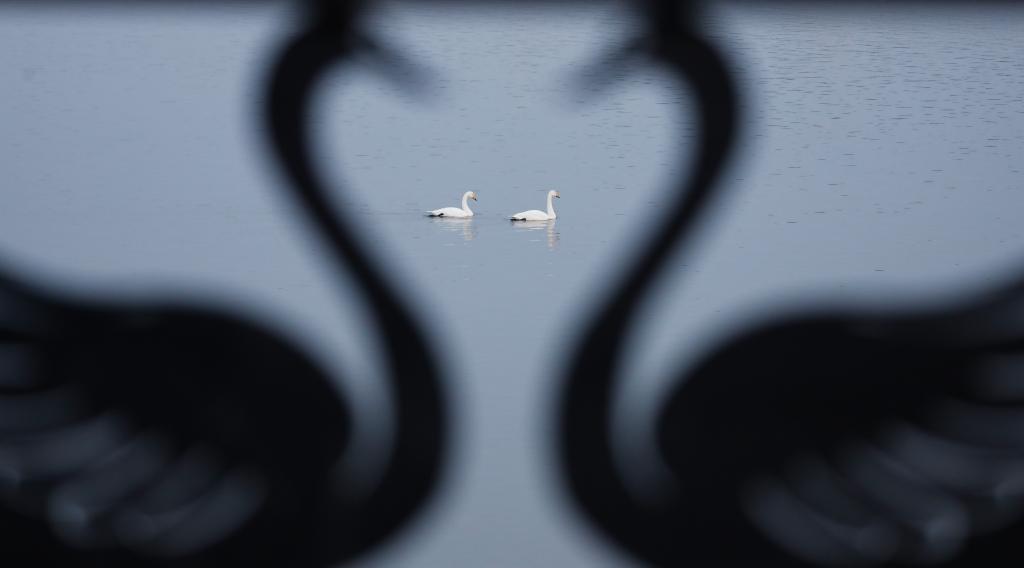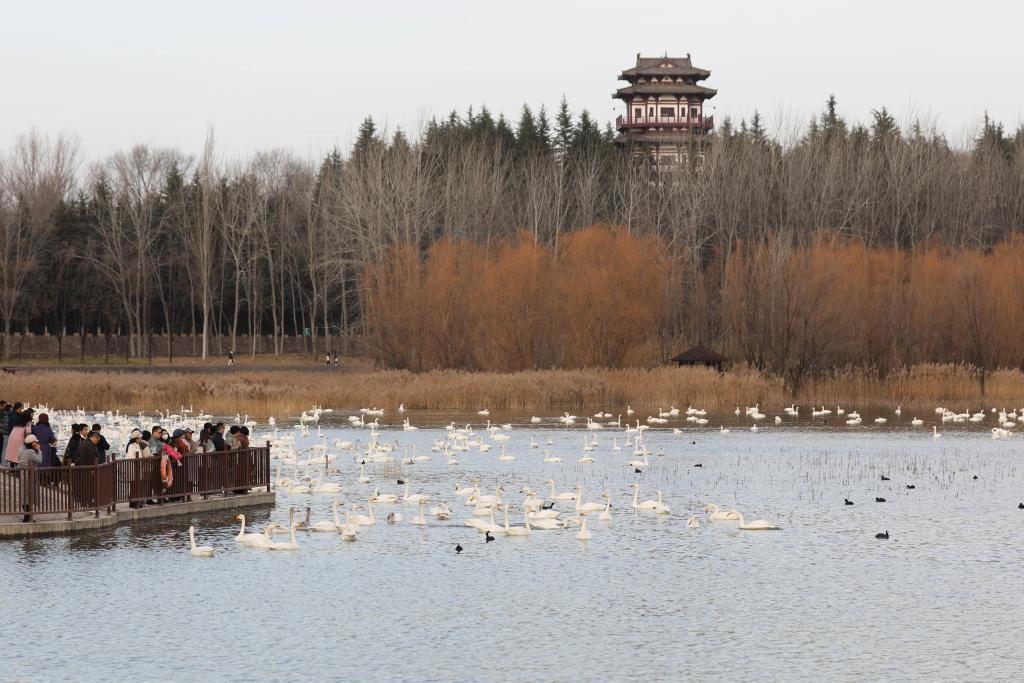 12月20日,游客在河南省三门峡市天鹅湖国家城市湿地公园观赏白天鹅。