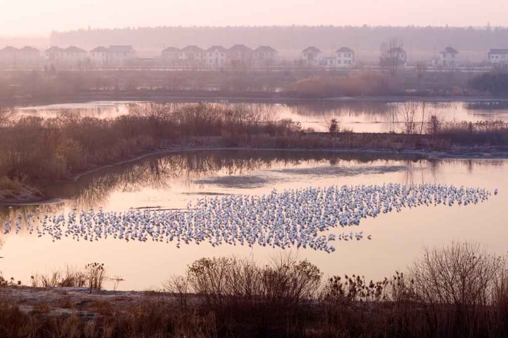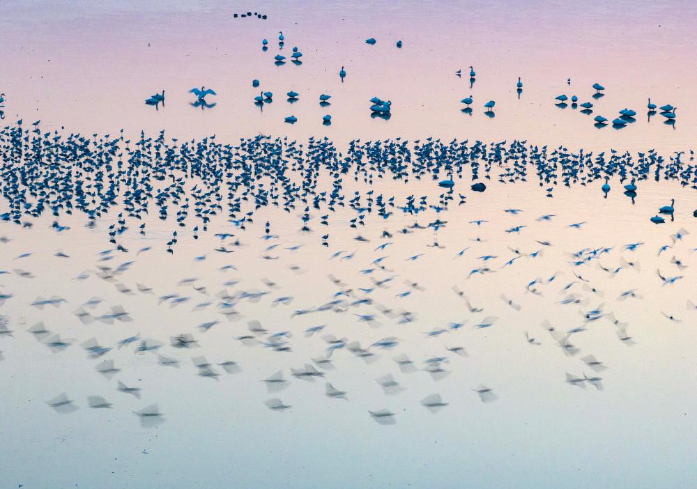 近日,大批候鸟飞抵江苏省兴化市里下河国家湿地公园,成群结队在浅滩觅食、休憩。近年来,当地生态环境持续改善,越冬候鸟数量逐年增多。