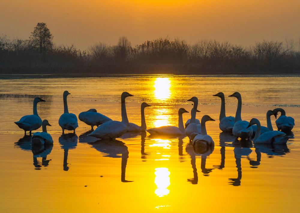 12月28日,一群天鹅在江苏兴化里下河国家湿地公园浅滩上栖息(无人机照片)。