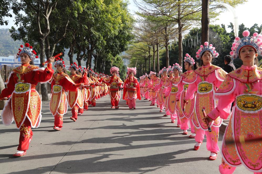 尤为引人注目的是队伍中的男女对打环节:男队员步伐刚健,尽显英雄气概;女队员飒爽灵动,化身穆桂英、梁红玉等巾帼英雄与梁山好汉“对阵”,视觉张力十足。桃园英歌总队长郑浩彬介绍:“男子英歌主要是武,动作有南拳马步、弓步等;女子英歌要考虑柔,动作以舞为主。”这种独特形式不仅丰富了英歌舞的艺术表达,更打破了其传统上由男性参与的性别局限,吸引越来越多年轻人投身传承。