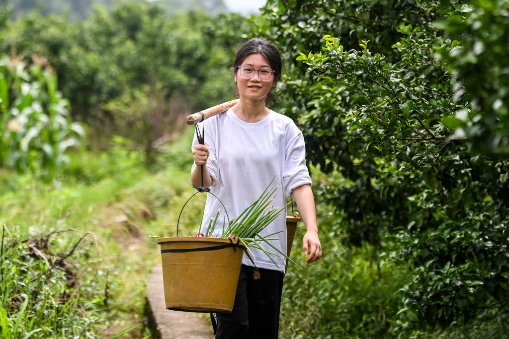 刘燕家的菜地面积不大,蔬菜整整齐齐排列,刚浇过水的菜叶上挂着水珠。给菜地浇完水,她和母亲便准备回家。两人收拾好农具,刘燕自然地挑起扁担。一路上,刘燕的脊背挺直,步子稳健,母亲跟在她身后,脚步不快,两人沿着田埂前行……