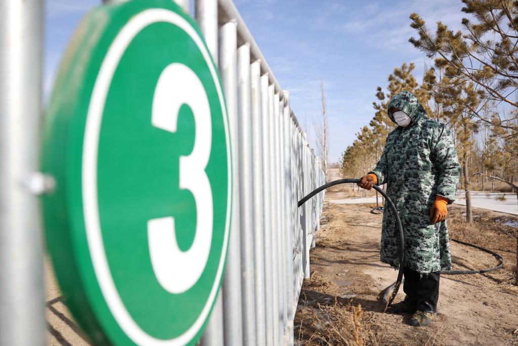 甘肃濒危动物保护中心普氏野马饲养繁育基地工作人员祁金龙在栏杆外为普氏野马的饮水槽加水(2月3日摄)。历经近40年科学保护与系统繁育