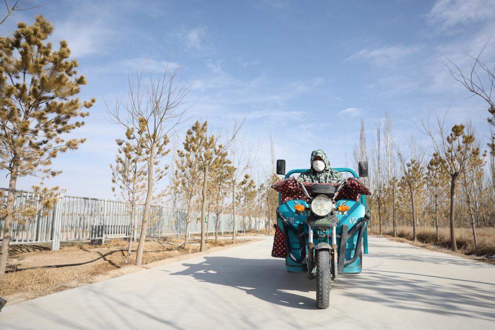 甘肃濒危动物保护中心普氏野马饲养繁育基地工作人员祁金龙骑着三轮车为普氏野马运送饲草料(2月3日摄)。
