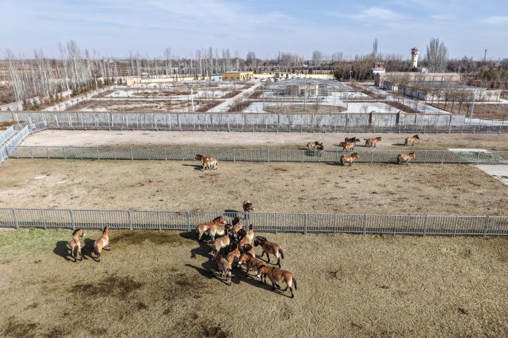 2月3日,在甘肃濒危动物保护中心普氏野马饲养繁育基地,一群普氏野马在圈舍内奔跑。截至目前