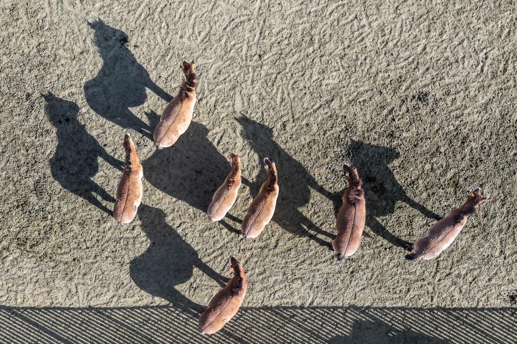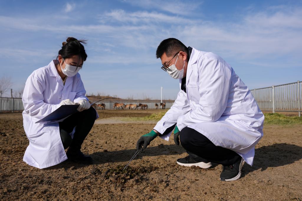 2月3日,在甘肃濒危动物保护中心普氏野马饲养繁育基地,工作人员观察普氏野马粪便。