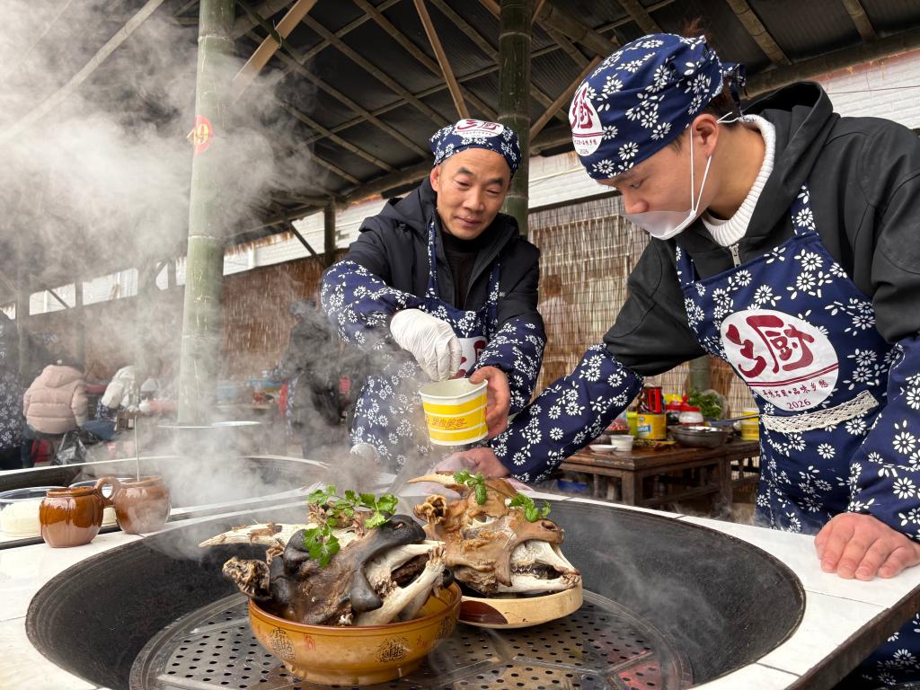 在村里从事黑山羊养殖的杨勇,也是一名地道的乡村厨师。这次比赛,他们团队还特意给每道菜取了别致的名字:蒸羊头叫“鸿运当头”,麻辣羊蹄称“金榜题名”,嚼劲十足的羊排又称“步步高升”……“乡里首次举办这么热闹的比赛,我们要晒出家乡的好风味。”杨勇说。