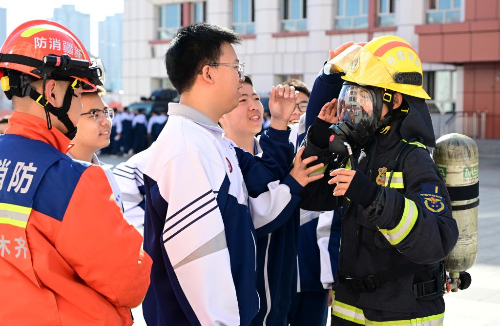 3月30日,在乌鲁木齐市第一中学(高新校区),学生在消防救援人员的指导下轮流试穿消防战斗服。