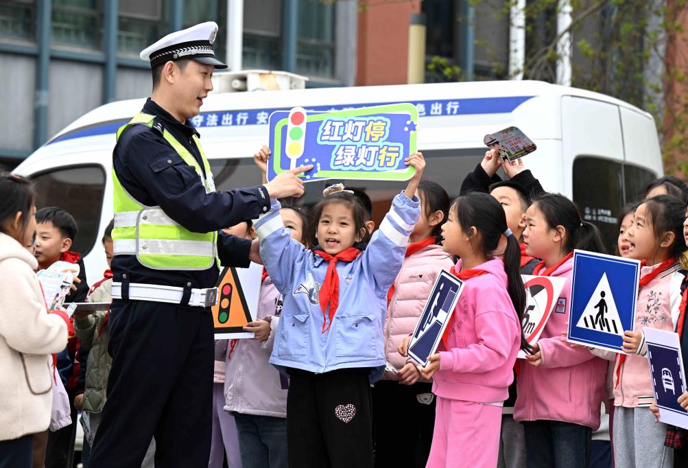3月30日,在河北省石家庄市柏林庄学校开展的安全教育主题活动中,交警为小学生讲解交通安全知识。
