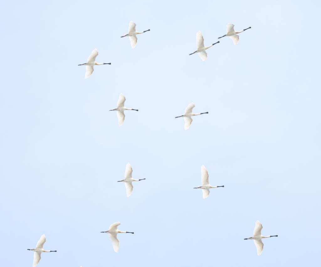 4月14日,一群黑脸琵鹭在辽宁省庄河市石城乡形人坨上空飞行。