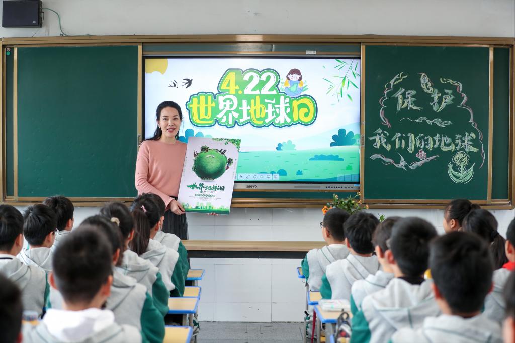 4月22日,在江苏省泰州市姜堰区康华小学,老师给学生讲解保护地球的相关知识。