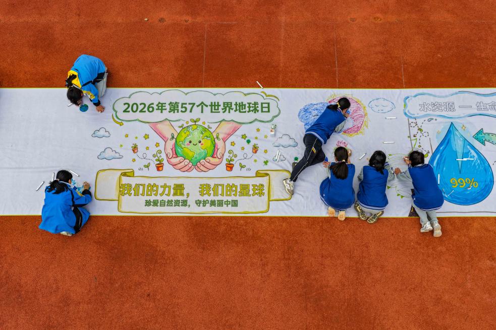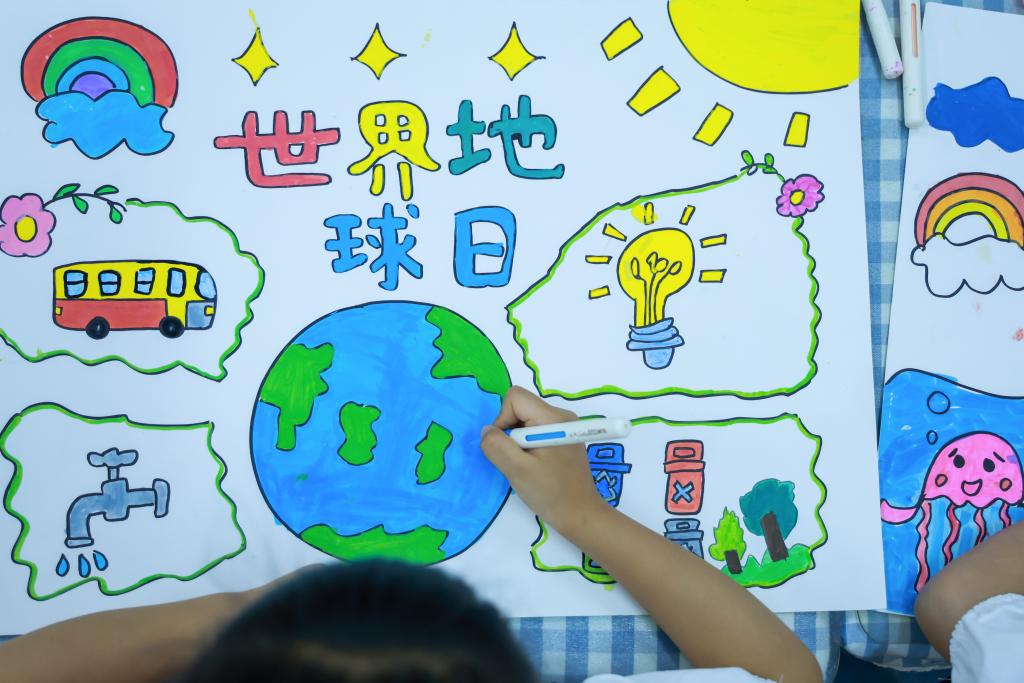 4月21日,山东省枣庄市市中区光明路小学学生在绘制“珍爱地球 守护美丽家园”画卷。