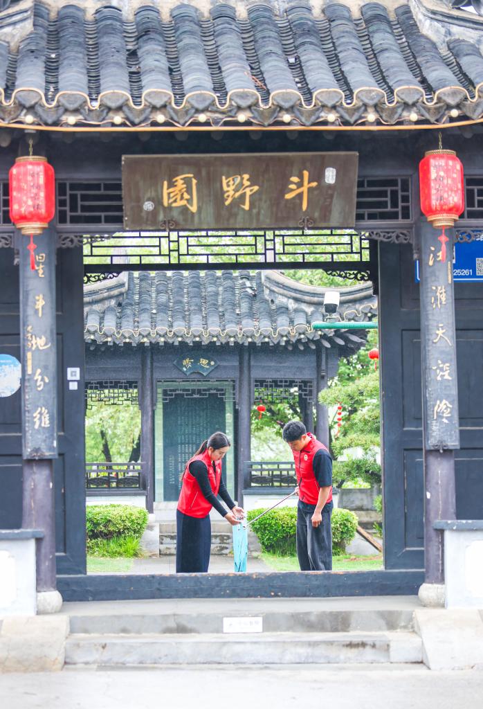 4月22日,在江苏省扬州市江都区邵伯镇,当地文明实践中心志愿者在捡拾垃圾。