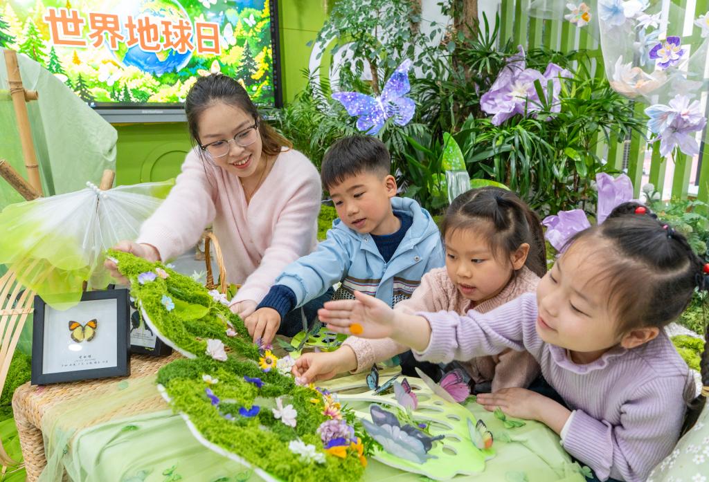 4月22日,江苏省南通市通州区金洲幼儿园的孩子们用捡拾的本土自然素材拼贴蝶翼手作。