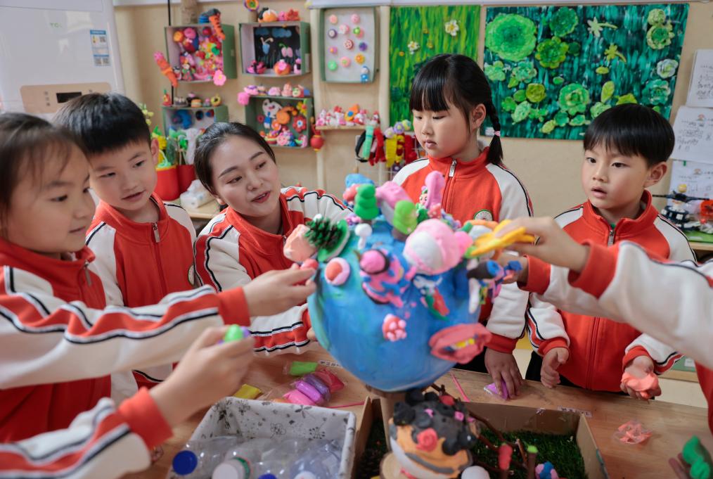 4月22日,在贵州省黔东南苗族侗族自治州施秉县第四幼儿园,老师指导孩子们制作以地球为主题的手工作品。