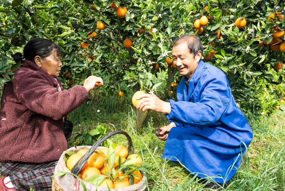 4月23日,周功寿(右)直播接单后,和老伴王学凤在果园采摘脐橙准备发快递。