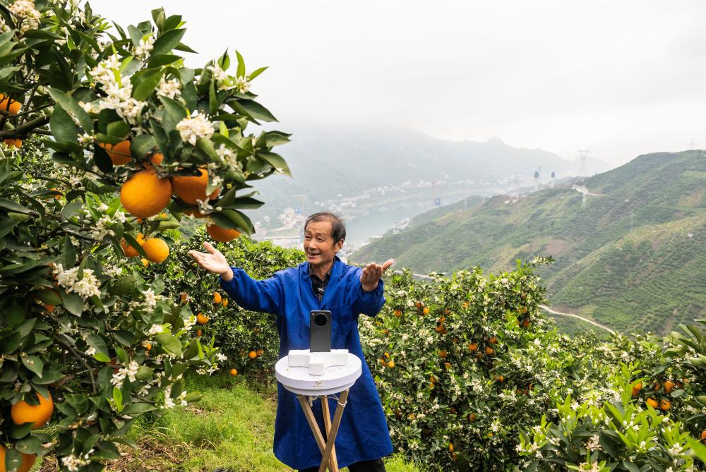 四月的三峡,峡江两岸山花遍野,沉甸甸的脐橙挂满枝头,花果同枝的盛景格外喜人。“大家好!我是秭归猴哥……”洪亮的声音从果园里传来——七旬老人周功寿正对着手机直播,脐橙的果香仿佛透过屏幕扑面而来。