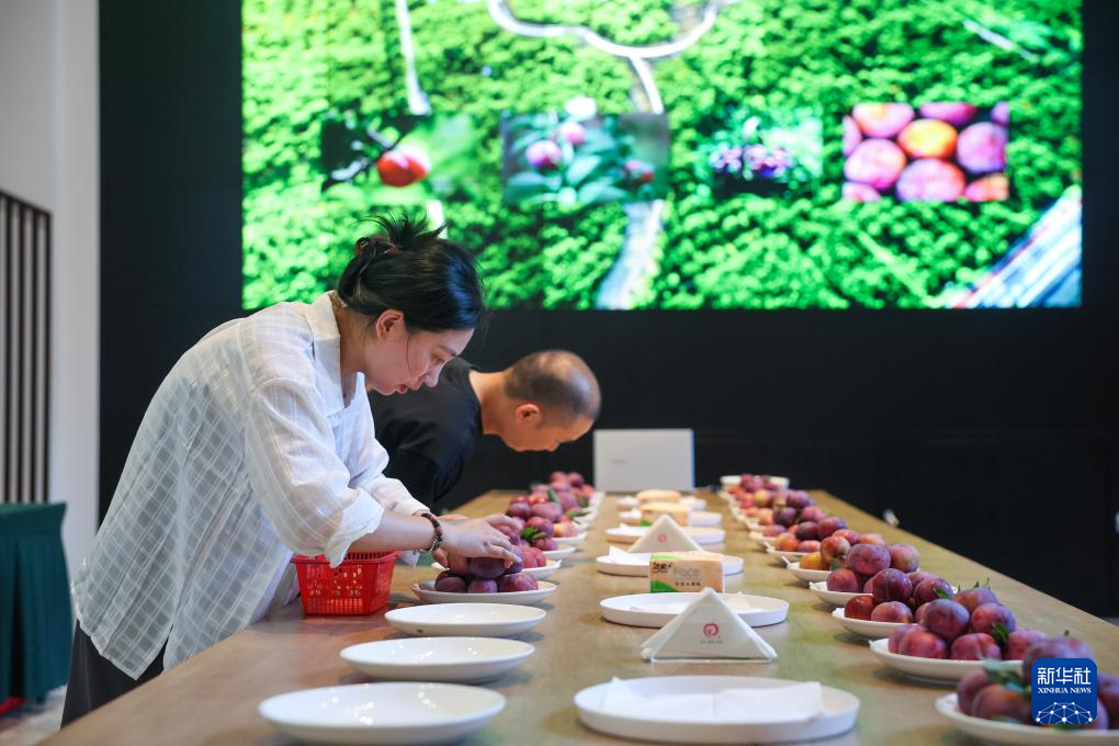 6月18日,在桃园村槜李堂举行的“槜李王”评选大赛上,工作人员摆放种植大户选送的槜李。