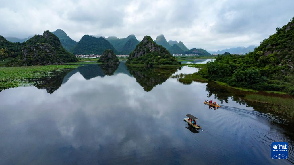 6月18日,游客在普者黑景区内乘船游览(无人机照片)。