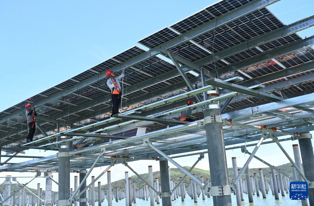 6月20日,施工人员在海上光伏电站现场进行安装作业。