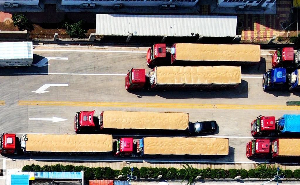 6月15日,在山东省临沂市平邑县一处粮食储备库夏粮收购现场,运输车辆排队售粮(无人机照片)。新华社发(武纪全 摄)