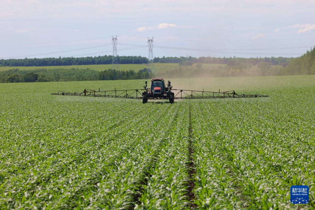 6月24日,在北大荒集团北安分公司二龙山农场有限公司第六管理区的玉米种植地块,一台自走式喷药机在喷施肥料。