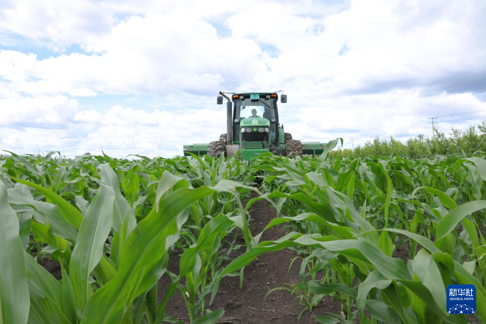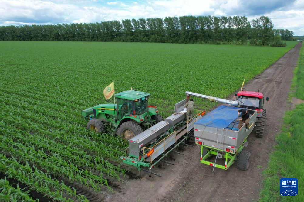 6月23日,在北大荒集团建设农场有限公司第四管理区田间,农机工人驾驶大马力机车对玉米进行中耕追肥作业。