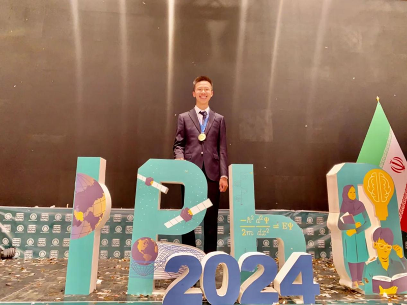 浙江省温州中学学生金树雨在2024年第54届国际物理奥林匹克竞赛颁奖现场。(温州中学供图)